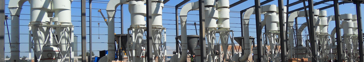 大塊物料經(jīng)顎式破碎機(jī)破碎到所需粒度后,由提升機(jī)送至儲料斗,再由皮帶機(jī)將物料均勻定量連續(xù)地送入6臺MTW175歐版磨的主機(jī)磨室內(nèi)進(jìn)行研磨。粉磨后的物料被風(fēng)機(jī)氣流送入選粉機(jī)進(jìn)行分級,在選粉機(jī)葉輪的作用下,不符合細(xì)度要求的物料落入磨室內(nèi)重新碾磨,合格的物料則經(jīng)空氣斜槽進(jìn)入旋風(fēng)集粉器內(nèi),進(jìn)行分離收集,經(jīng)排料裝置排出即為成品粉體。